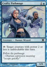 Casting Cost:   Card Type: Creature - Human Wizard Card Text: : Target creature with power 2 or less is unblockable this turn. Flavor Text: Follow the pathmage —Otarian expression meaning "escape quickly" Artist(s): Wayne England: (Ninth Edition, Onslaught, Tenth Edition) Power/Tough: 1/1 Rarity: Common: (Ninth Edition, Onslaught, Tenth Edition) |