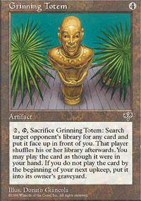 Casting Cost:  Card Type: Artifact Card Text: , , Sacrifice Grinning Totem: Search target opponent's library for a card and remove it from the game. Then that player shuffles his or her library. Until the beginning of your next upkeep, you may play that card. At the beginning of your next upkeep, if you haven't played it, put it into its owner's graveyard. Flavor Text: Artist(s): Donato Giancola: (Mirage, Sixth Edition, Time Spiral - Timeshifted) Rarity: Rare: (Mirage, Sixth Edition, Time Spiral - Timeshifted) |