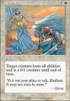 Casting Cost: Card Type: Instant Card Text: Target creature loses all abilities and becomes 0/1 until end of turn. Flavor Text: "It is not your place to rule, Radiant. It may not even be mine." —Serra Artist(s): Val Mayerik: (Urza's Saga) Rarity: Uncommon: (Urza's Saga) | ||||||||||||