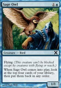 When Sage Owl comes into play, look at the top four cards of your library, then put them back in any order. Flavor Text: The owl asks but never answers. Artist(s): Cyril Van Der Haegen: (Magic 2010), Mark Brill: (Eighth Edition, Seventh Edition, Tenth Edition), Mark Poole: (Sixth Edition, Weatherlight) Power/Tough: 1/1 Rarity: Common: (Eighth Edition, Magic 2010, Seventh Edition, Sixth Edition, Tenth Edition, Weatherlight) |