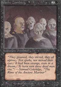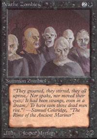 Casting Cost: Card Type: Creature - Zombie Card Text: Flavor Text: "They groaned, they stirred, they all uprose, Nor spake, nor moved their eyes; It had been strange, even in a dream, To have seen those dead men rise." —Samuel Taylor Coleridge, "The Rime of the Ancient Mariner" Artist(s): Jesper Myrfors: (Alpha, Beta, Fourth Edition, Revised, Sixth Edition, Starter 2000, Unlimited), Kev Walker: (Eighth Edition, Ninth Edition, Seventh Edition, Tenth Edition), Tom Kyffin: (Fifth Edition, Starter 1999) Power/Tough: 2/2 Rarity: Common: (Alpha, Beta, Eighth Edition, Fifth Edition, Fourth Edition, Ninth Edition, Revised, Seventh Edition, Sixth Edition, Starter 1999, Starter 2000, Tenth Edition, Unlimited) | ||||||||||||||||||||||||||||||||||||||||||||||||||||||||