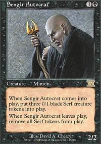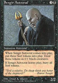Casting Cost:   Card Type: Creature - Human Card Text: When Sengir Autocrat comes into play, put three 0/1 black Serf creature tokens into play.