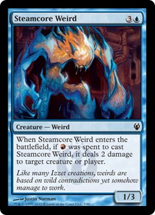 Casting Cost: Card Type: Creature - Weird Card Text: When Steamcore Weird comes into play, if Flavor Text: Like many Izzet creations, weirds are based on wild contradictions yet somehow manage to work. Artist(s): Justin Norman: (Ajani vs. Nicol Bolas, Guildpact, Izzet vs. Golgari) Power/Tough: 1/3 Rarity: Common: (Ajani vs. Nicol Bolas, Guildpact, Izzet vs. Golgari) | ||||||||||||||||||||||||