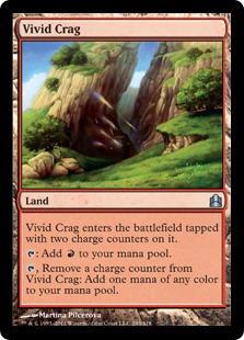 Card Text: Vivid Crag comes into play tapped with two charge counters on it.