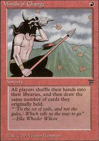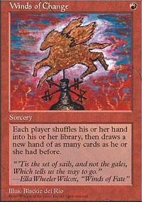 Casting Cost: Card Type: Sorcery Card Text: Each player shuffles the cards from his or her hand into his or her library, then draws that many cards. Flavor Text: "'Tis the set of sails, and not the gales, Which tells us the way to go." —Ella Wheeler Wilcox Artist(s): Adam Rex: (Portal), Blackie del Rio: (Fifth Edition), Justin Hampton: (Fourth Edition, Legends) Rarity: Uncommon: (Legends), Rare: (Fifth Edition, Fourth Edition, Portal) | ||||||||||||||||||||||||||||||